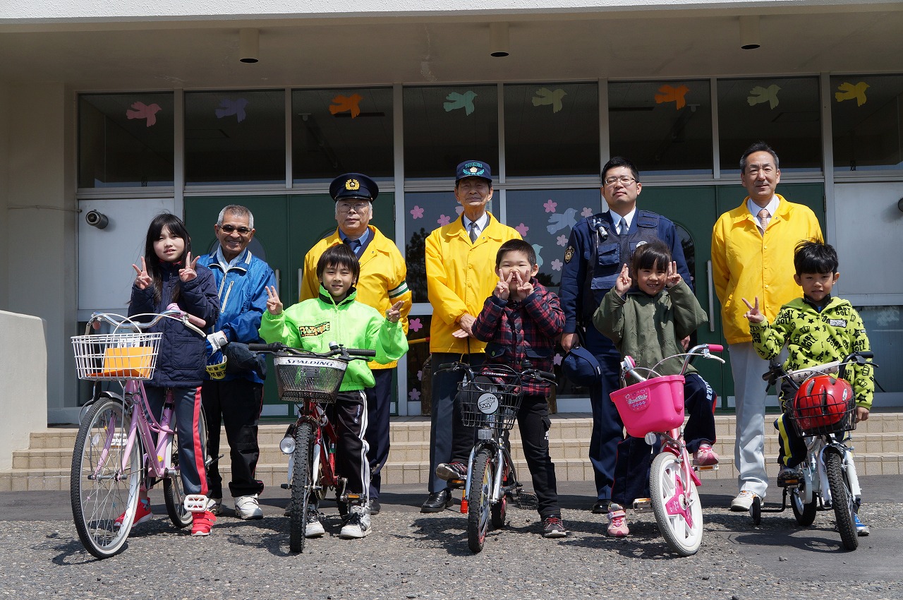 4月22日(交通安全青空教室):協力していただいたみなさんと一緒に記念撮影!これからも、交通事故に十分注意をしてほしいです。